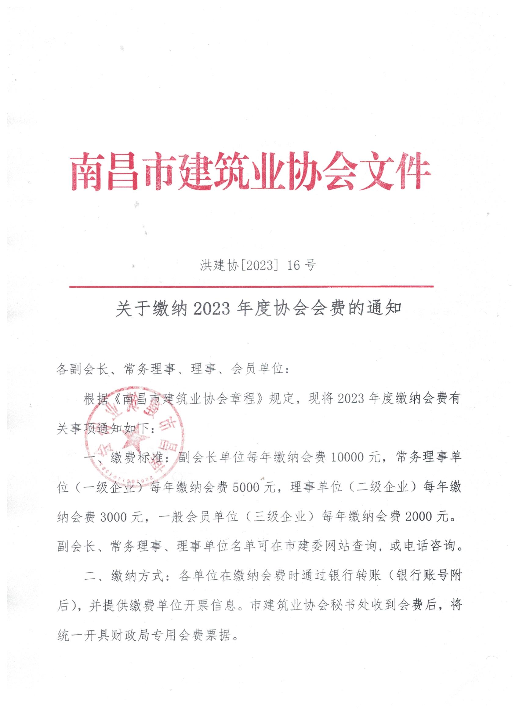 南昌市建筑业协会关于缴纳2023年度协会会费的通知